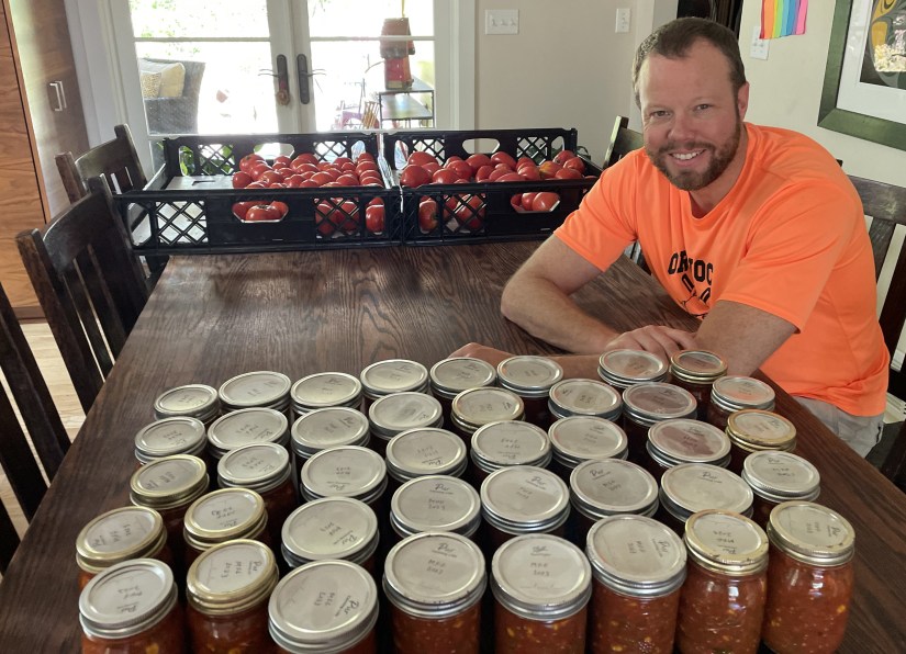 Our salsa ingredients were slicer tomatoes, poblanos, red onions, garlic, jalapenos, and cilantro, all from the farm. We did add some frozen corn because I can’t grow sweet corn for the life of me, but it was still very satisfying to see so many jars filled nearly entirely with food we had grown with our own hands.