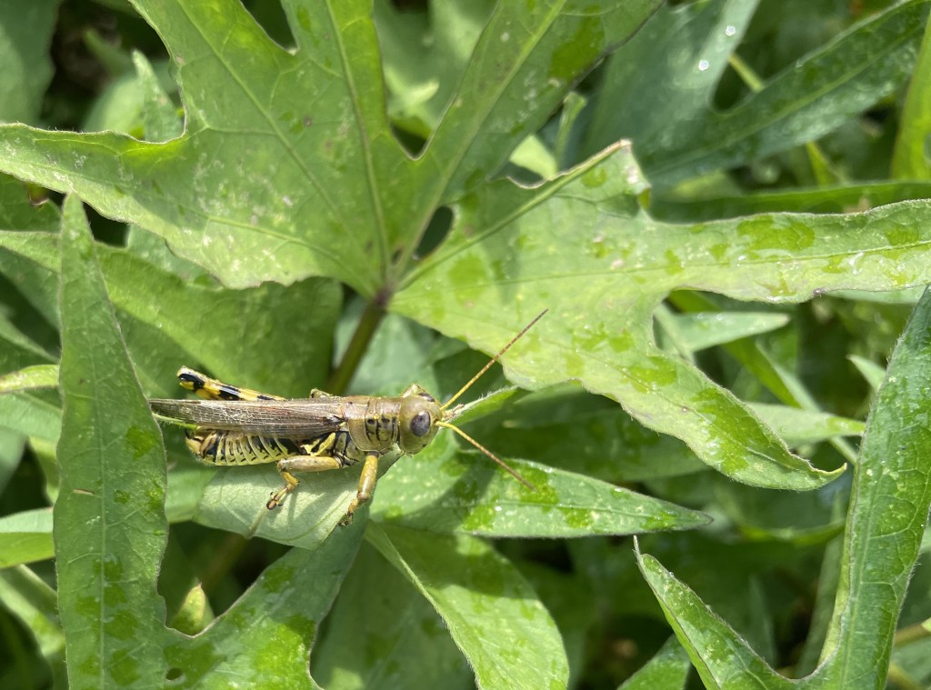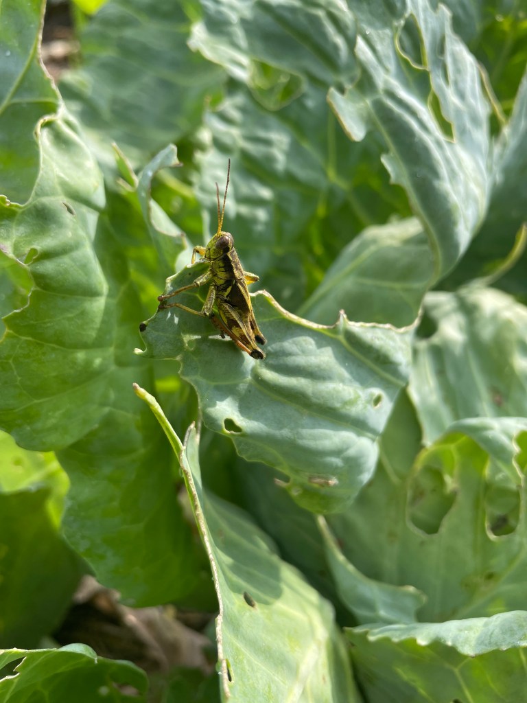 One thing that I’ve been noticing in the field this summer is the near-plague of grasshoppers down there. Every year there seems to be one bug that defines the season. Five years ago, it was slugs who were all over the brassicas; we would pull up the straw mulch underneath the plants and find dozens of them huddled together. (Sorry. I know that’s gross!). Then there was the potato beetle year and the cucumber beetles year. 2023 is definitely the year of the grasshopper. There-are-so-many-grasshoppers!
