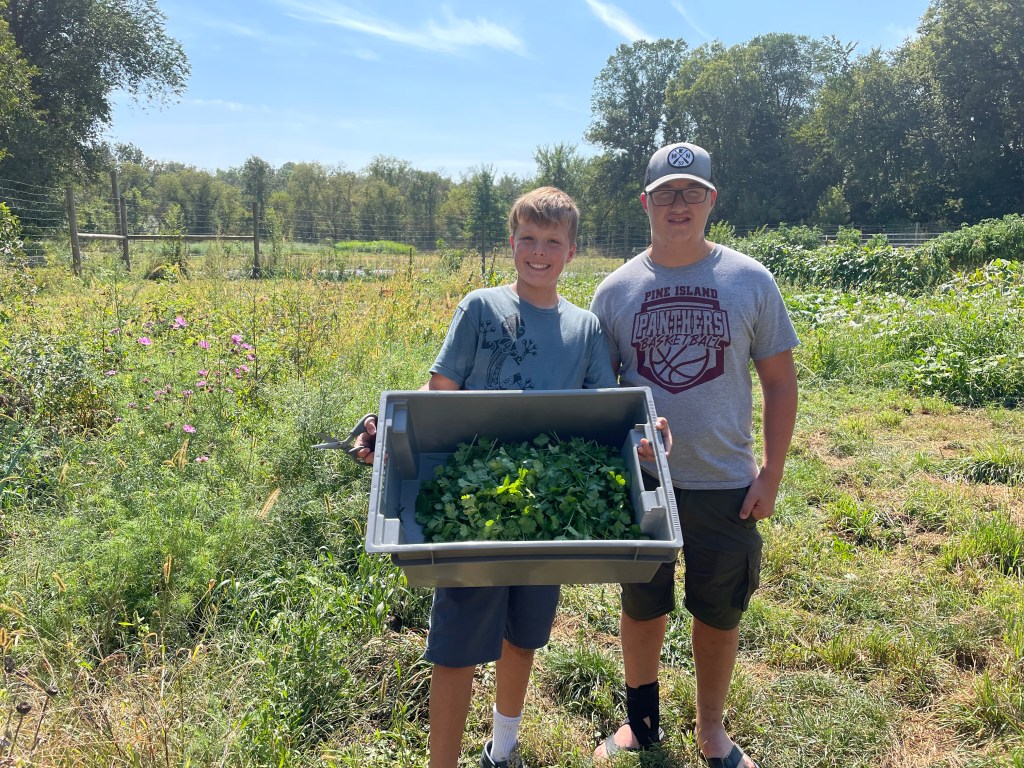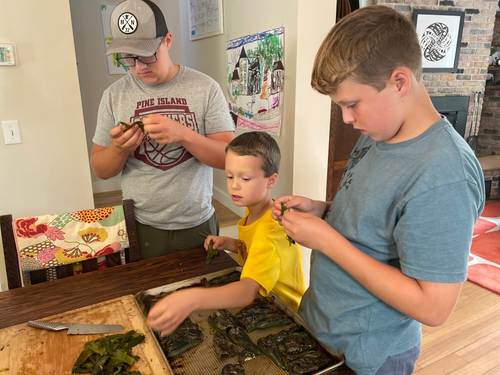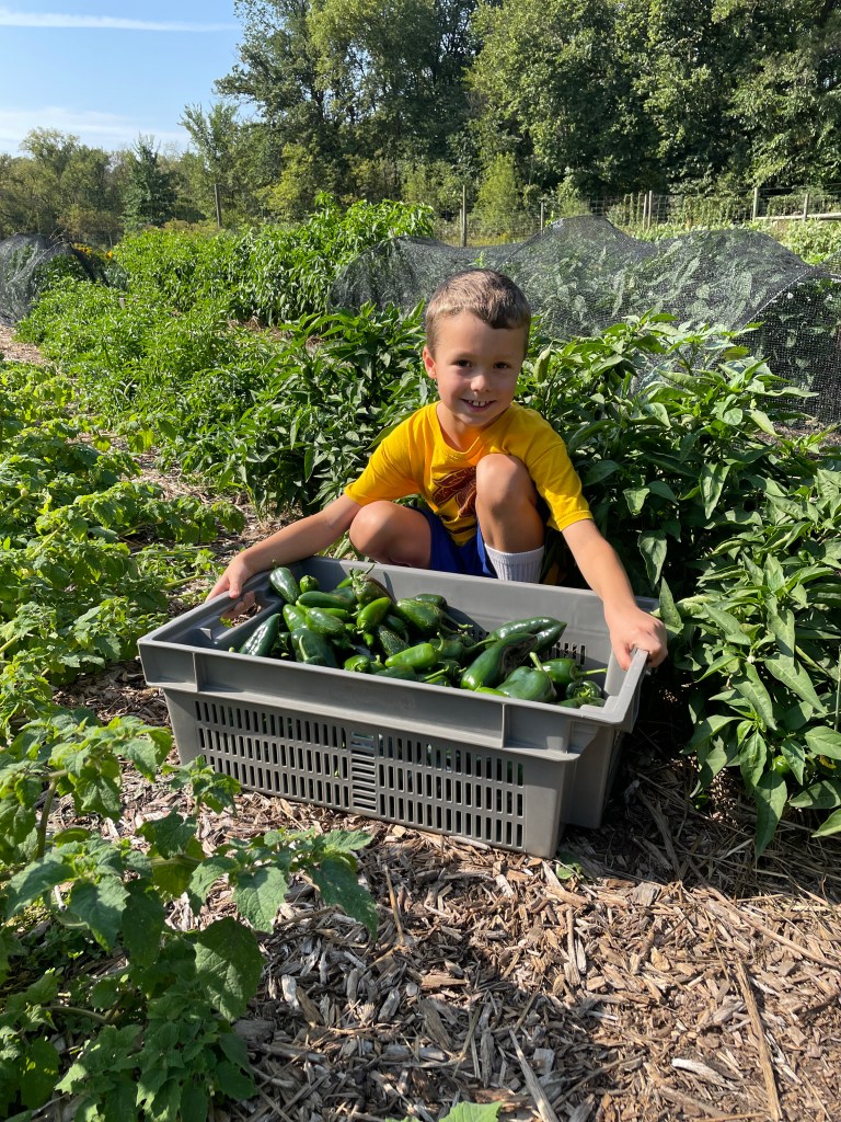 We are so over the heat! This past weekend, out of protest of the weather, I decided to do the absolute bare minimum in the field (i.e., watering!) and move operations inside where it was cooler. Thus, we Saturday making salsa. Luka and I harvested the poblanos and tomatoes. Simon and his buddy, Jace, gathered all the cilantro in the field, and we all acted as Erik’s sous chefs, prepping ingredients, while Erik did the brunt of the work.