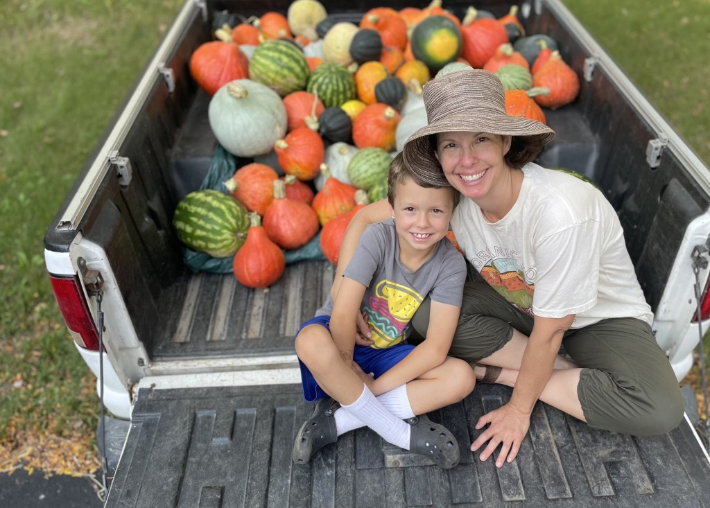 Also, we will harvest whatever is left in the field and either donate it or preserve it for us to eat over the winter. I’m not sure if the Swiss chard left in the field is still edible though? Luka is pretending its leaves are his wings, so I’m going to guess… maybe not! 🙂