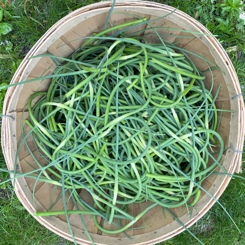 Garlic Scapes – Garlic scapes are the flower stalks of hard-neck varieties of garlic plants. We have to cut these off before they flower so that the garlic puts energy into growing a big, fat bulb instead.