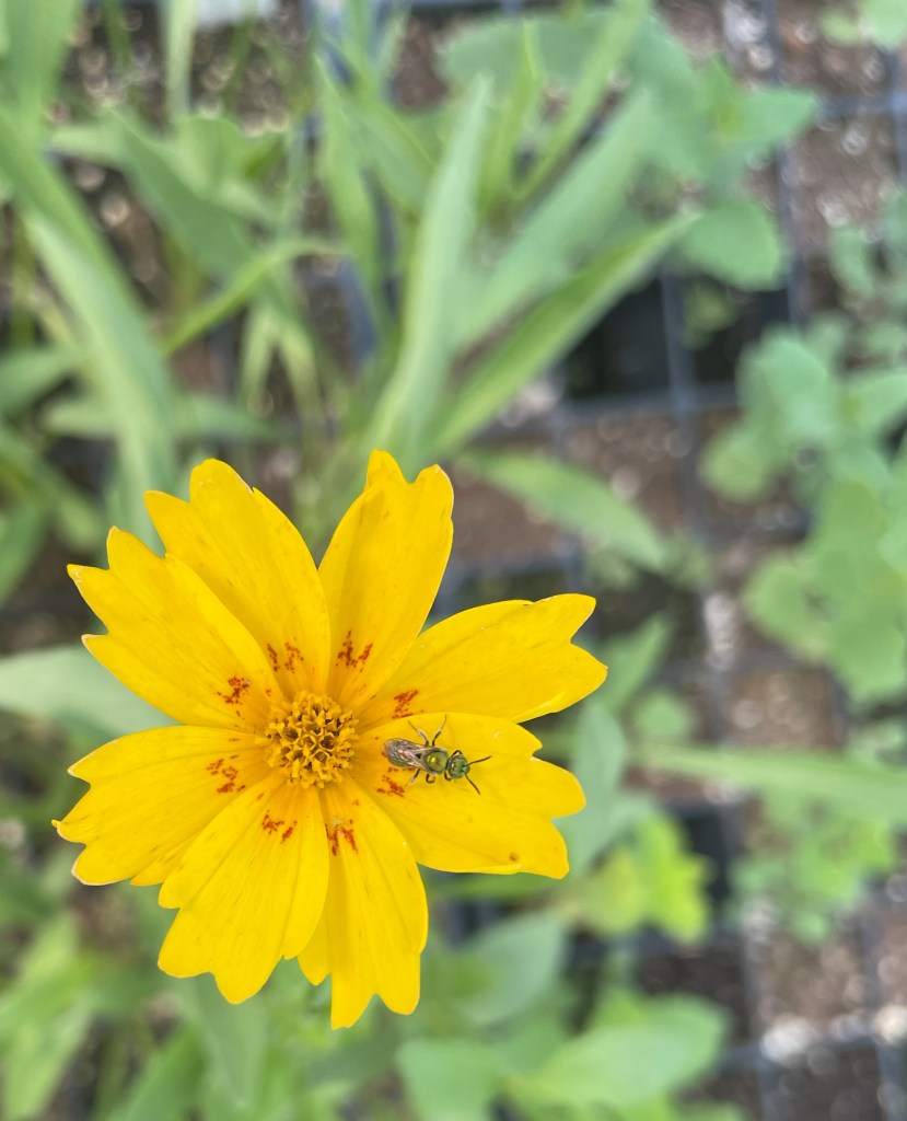 Of course, farming without chemicals gives us much more beauty than it does ugly things. Take this little pure green sweat bee that has been visiting the coreopsis I have growing in the greenhouse every day.