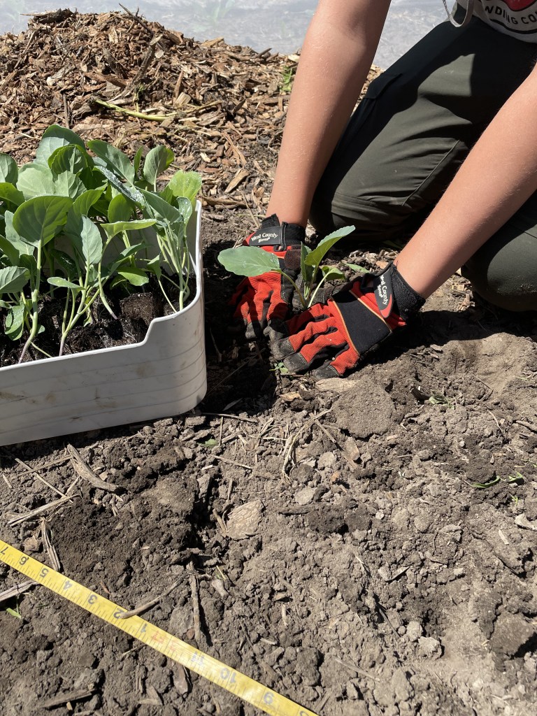 Once we had the beds prepped, we transplanted the gailaan (Chinese broccoli), sweet potatoes, and green cabbage. We seeded parsnips, basil, cilantro, and all of the winter squash -butternut, buttercup, delicata, pie pumpkins, potimarrons, and Jack o’Lanterns.