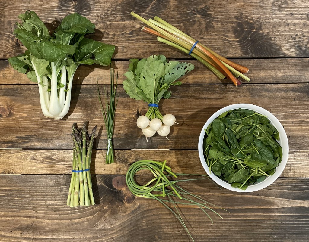 We also tried to figure out what was chewing holes in the bok choy, spinach, and salad turnip leaves. Some of our other brassica seedlings were completely eaten as well and we couldn’t figure out who the culprit was because of all of that protective covering we had placed on it. It turns out that grasshoppers lay their eggs in soil in the early spring, before the row cover is on, and then they hatch and get trapped underneath it with nothing to eat but the plants that are growing there. There are actually a whole slew of insects that have hatched under the row cover, but most of these aren’t interested in what we’re growing, so we just pull off the cover for a little while and free them. The tiny grasshoppers, on the other hand, have no incentive to leave because of… well, the leaves. (Dad joke!) We have decided that these holes are better than having flea beetle damage as grasshopper damage just means the leaves are a little ugly while flea beetle damage means there are no leaves at all.