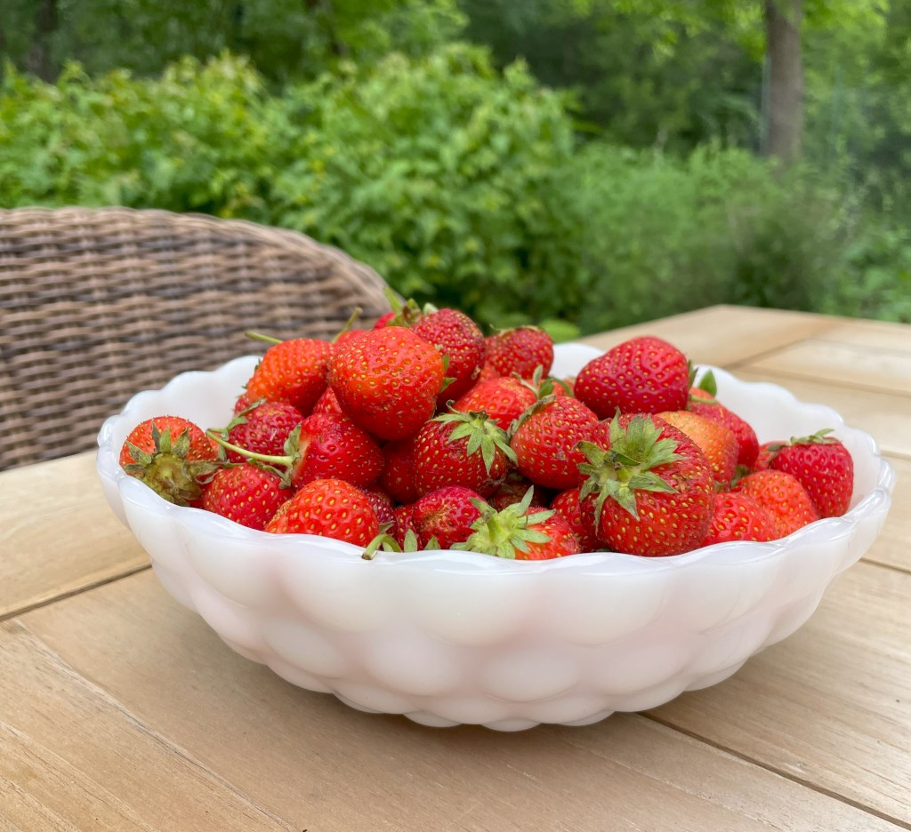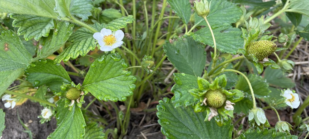 Right now, we are holding our breath to see what happens to this year’s strawberry crop. Besides strawberries being highly susceptible to fungi-causing diseases that tend to flourish under wet conditions, we’ve seen lots of blooms and many small berries which we are hoping will slow down their maturity. Once the berries start to enlarge and ripen, any rain beyond a certain amount will get pulled into the fruit by osmosis, leading to cracking.
