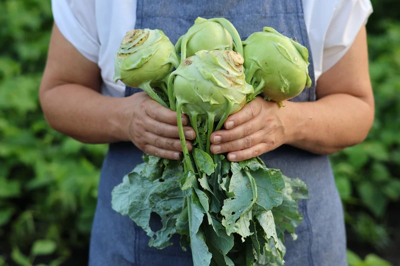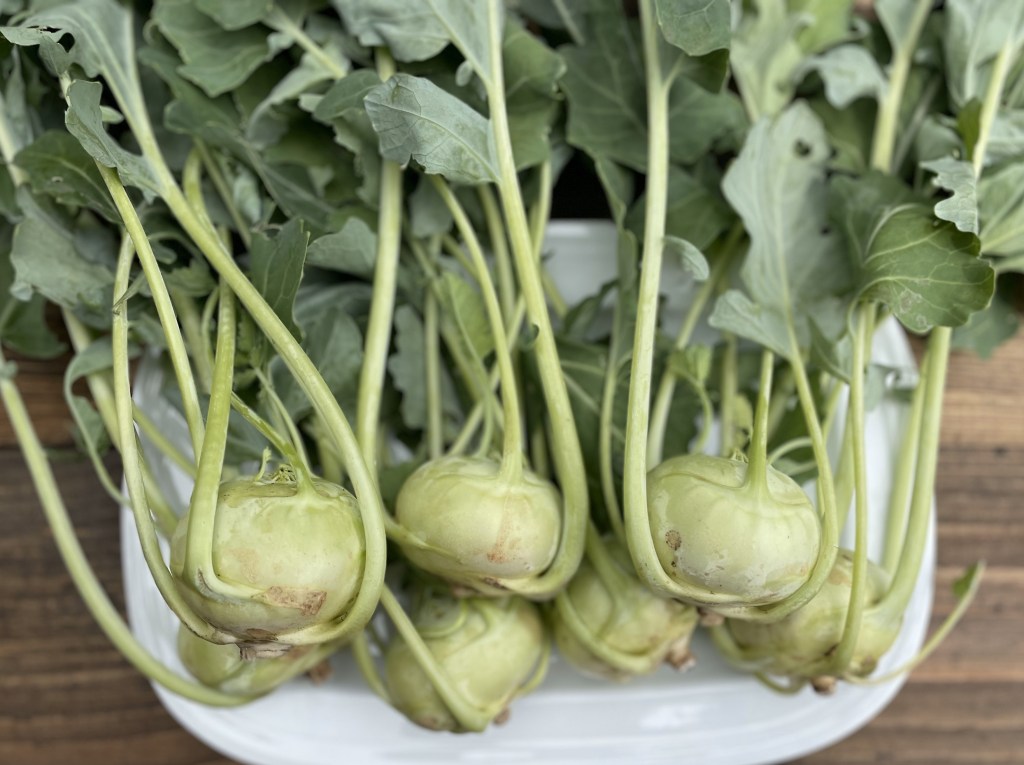 Kohlrabi – Store kohlrabi globe and leaves separately. The bulb will last for two weeks refrigerated in a plastic bag. Wrap leaves and stalks in a plastic bag and keep in the crisper drawer of the refrigerator. When ready to use, peel the outer layer first. This will remove those small brown spots which are simply where the bulb healed over after something or other took a few bites out of it and won’t affect the deliciousness at all.(Photo: High Mowing Seeds)