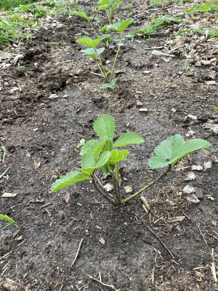 We planted two new varieties this year: Honeoye (I have no idea how to pronounce that) and Jewel. These are June-bearing varieties, meaning that they flower and fruit just one time a year, usually beginning at the end of June and going into July. Last year we tried a couple of everbearing varieties of strawberries, too. These produce once in the early summer and once again in the fall, but they wear themselves out making all of that fruit and so are only productive for at most two years. While you only get one harvest with June-bearing plants, they tend to produce for upwards of five years if well-nurtured, and so we are going back to those types. These scrawny little plants will completely fill out their 36″ wide rows by fall. We’ll probably even have to prune them back by then to keep them from getting too unruly.
