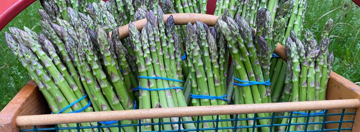Generally, we harvest asparagus for about four to five weeks, beginning in mid-May. We sell our asparagus by the pound.