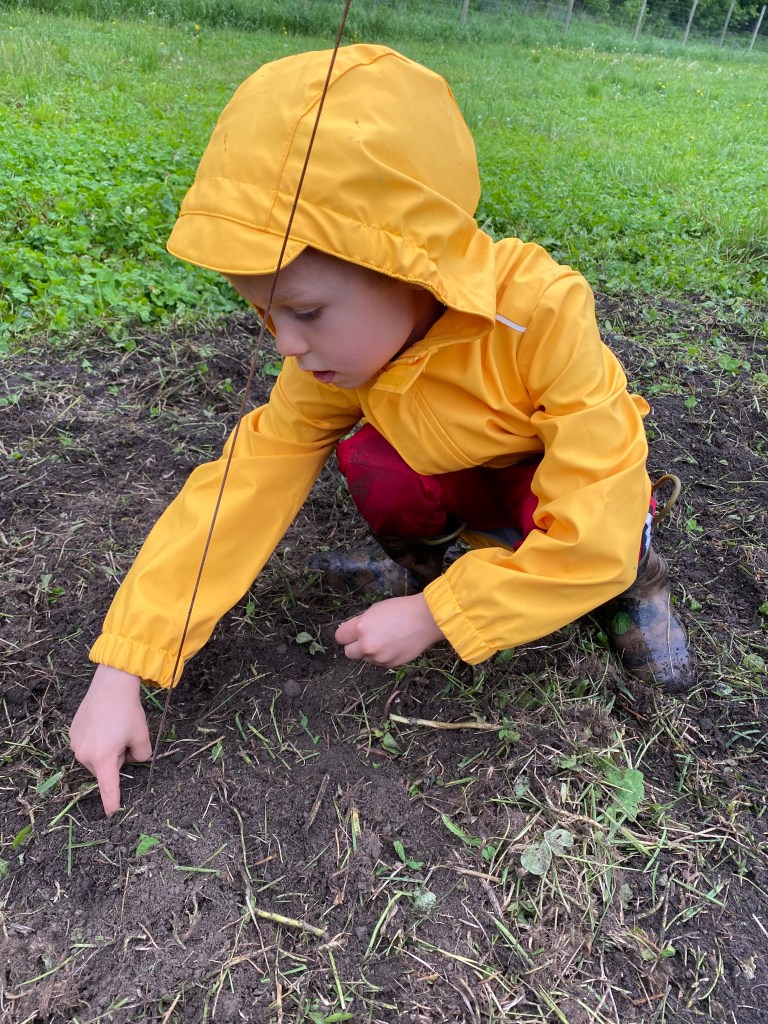 Erik and Luka ventured out into the light rain with me yesterday morning to get some winter squash and pumpkins seeds into the ground so that we could benefit from Mother Nature watering them for us over the course of the afternoon and evening. I am starting to see some flea beetle damage on the eggplants already (flea beetles are CRAZY for eggplant!), and I think the plants are large enough to come through, but I will keep an eye on them each day in case some sort of intervention is needed.