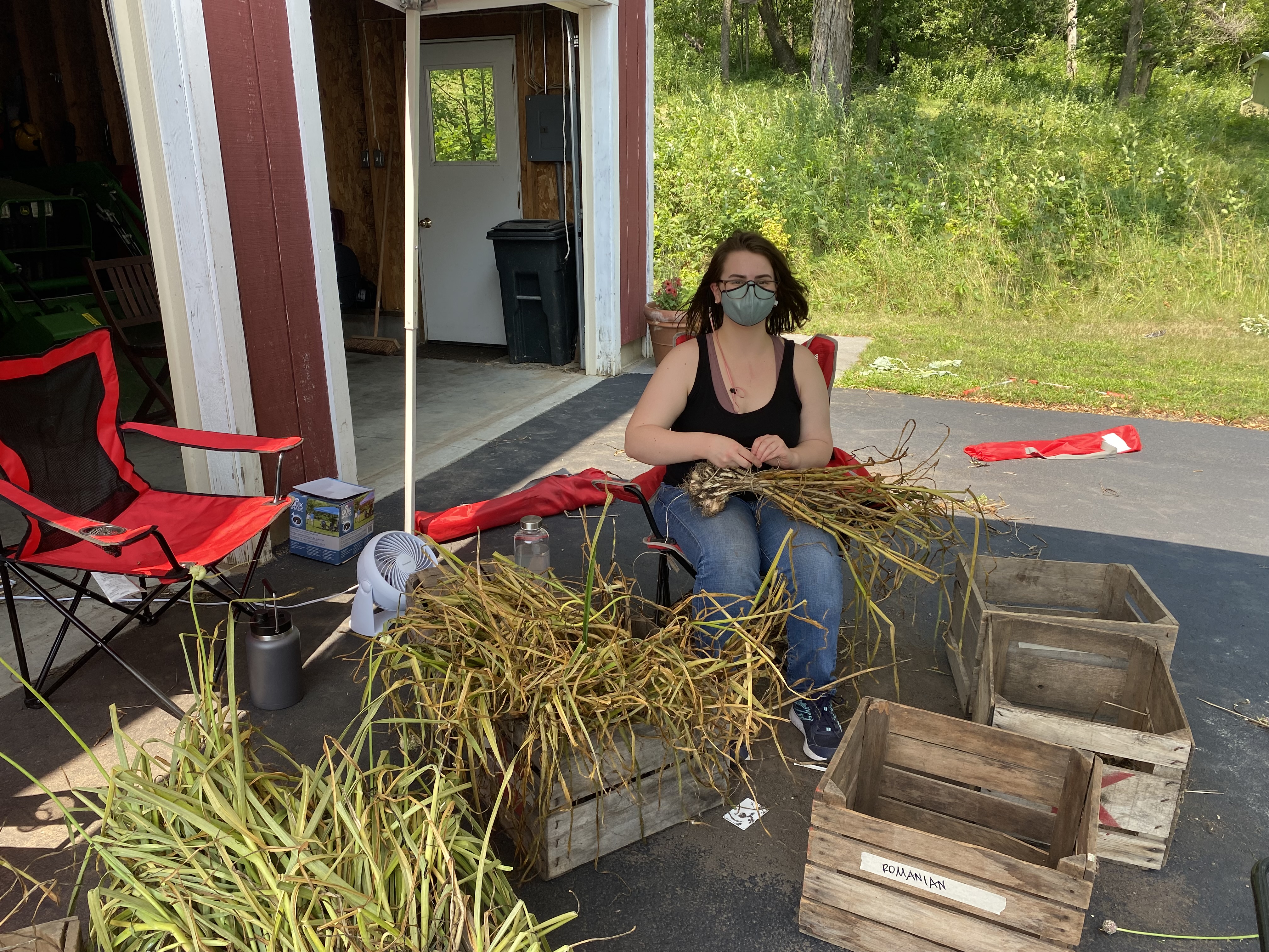 We think this is because, with spring being so late this year, not much else is growing out there and they are hungrier than usual. Still, we can’t let them graze on garlic. If the plants have to expend too much energy putting out new leaves to make up for the ones that were eaten, the bulbs will be smaller than we would like. Thus, we ran to the store Tuesday morning and purchased an electric fence to put around the field which we will install this weekend. To protect the beds in the meantime, I went to the nursery and filled 100 bags with 1/2 cubic yard of bulk sand that I hauled to the field and used them to hold down row cover that will block the deer until the fence goes up. It’s a good thing I’ve been working out this past winter. 100 bags of sand weighs a ton. You can imagine how well I slept that night!