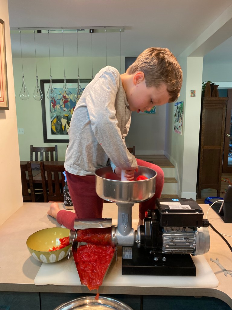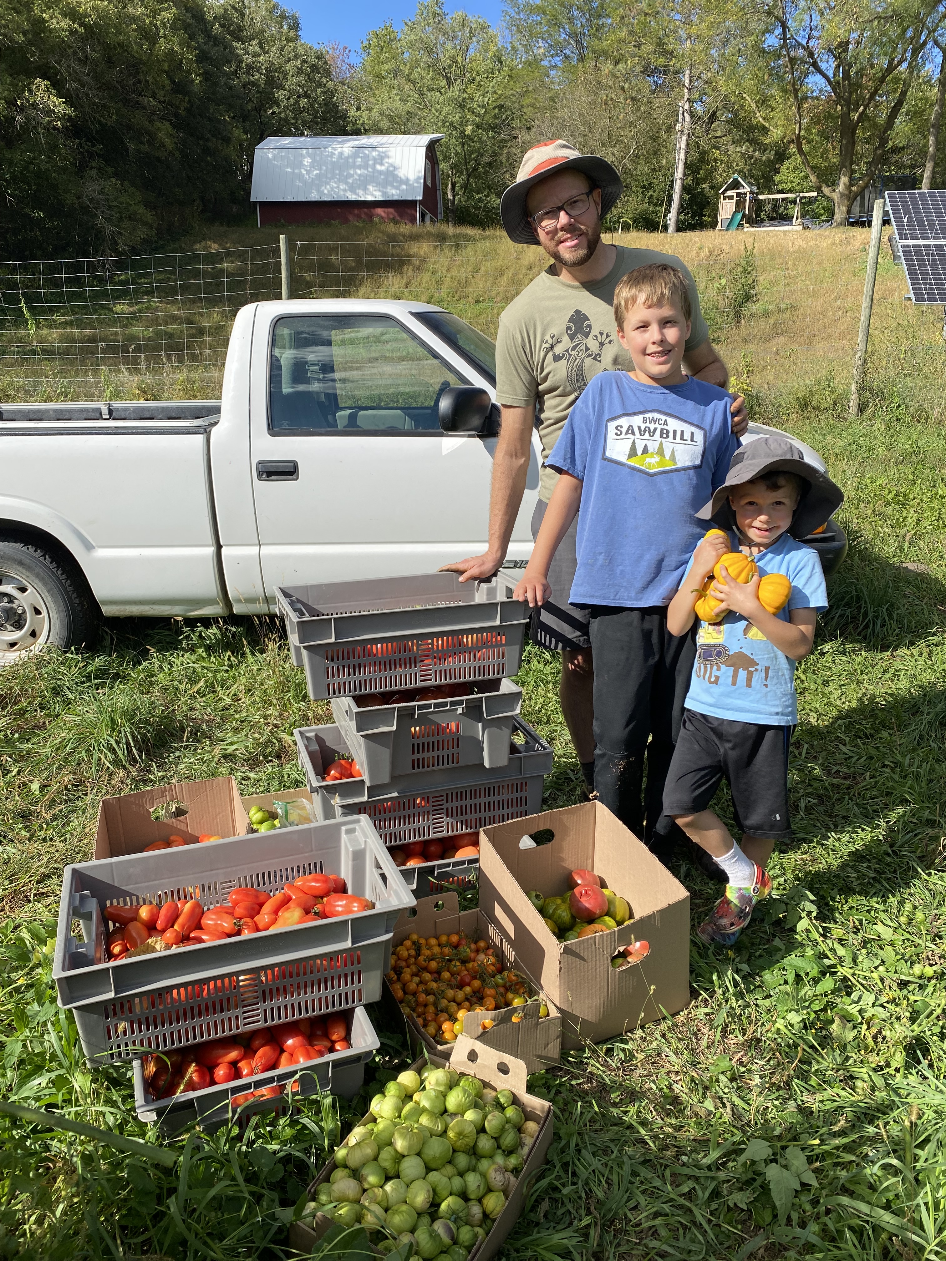 After discovering that frost was coming to the farm tonight, our family quickly mobilized yesterday to complete an epic harvest of all the ripe or ripening tomatoes and all the peppers, eggplants, tomatillos, and beans. Between shouts of “Thank you, tomatoes!” and “Thank you, eggplants!” we had fun racing to see who could harvest the most the fastest and marveling over just how many crates we were filling up. Erik was the most patient of us all, carefully cutting off vines laden with cherry tomatoes so that they could continue to ripen up in the barn without splitting.